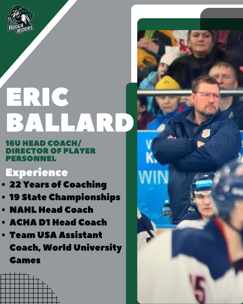 Ballard joins the RoughRiders from the Jackson Youth Moose program in Wyoming, where he served as Executive Hockey Director. Under his leadership, the program captured 19 Wyoming Amateur Hockey League State Championships over the past six seasons. His mentorship has helped players advance to AAA programs, prep schools, junior hockey, and collegiate hockey.