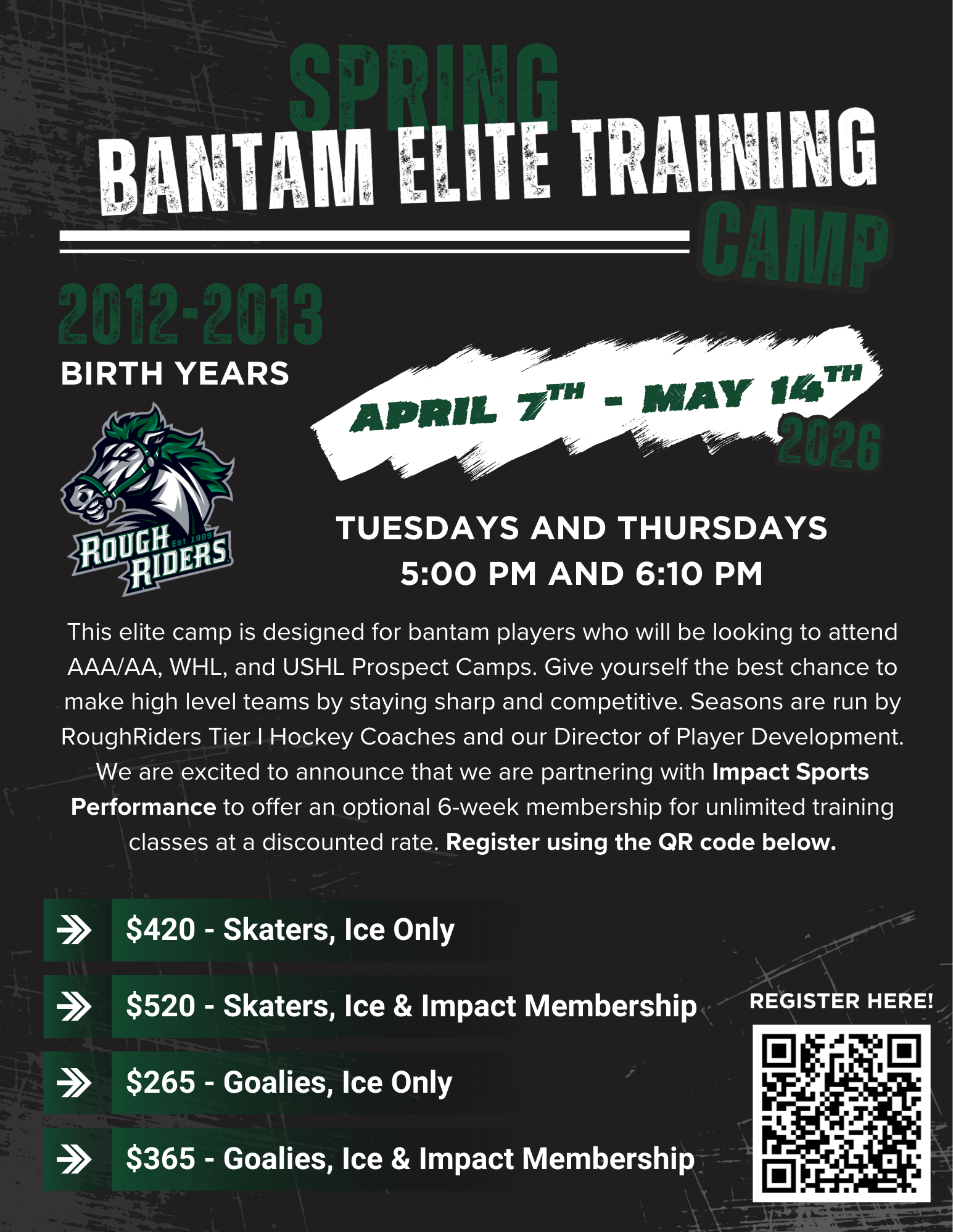 This camp is designed for Bantam players who will be looking to attend AAA/AA, WHL, and USHL Prospect camps. Give yourself the best possible chance to make high level teams by staying sharp and competitive. Camp will consist of Bantam specific game concept skill development, small area games, competition style drills to have players ready to compete and play at the next level. Sessions are run by RoughRiders Tier I hockey coaches and our Director of Player Development.