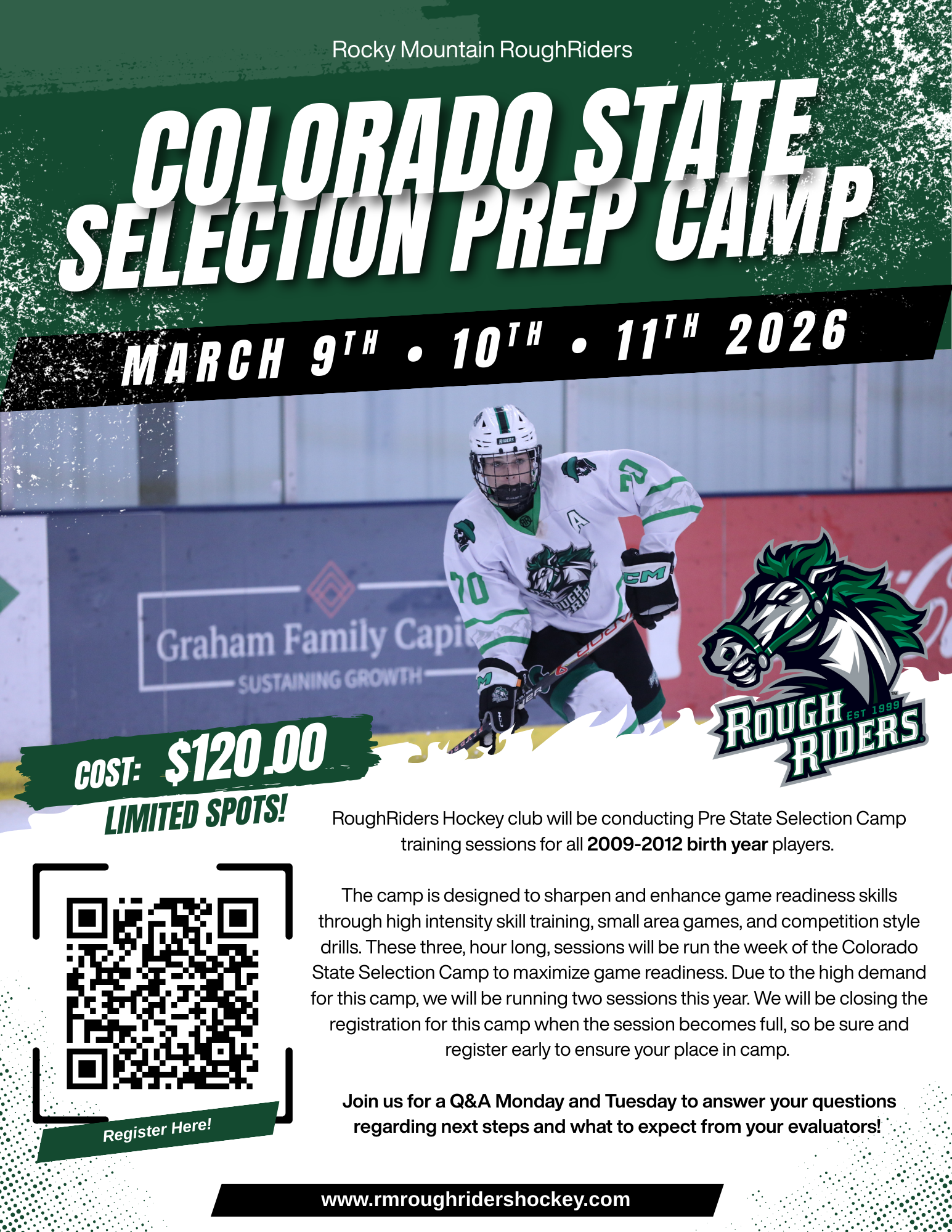 The Rocky Mountain RoughRiders will host Pre-State Selection Camp Training Sessions for 2009-2012 birth year players. This camp is designed to sharpen game-readiness through high-intensity skill development, small-area games, and competition-based drills.