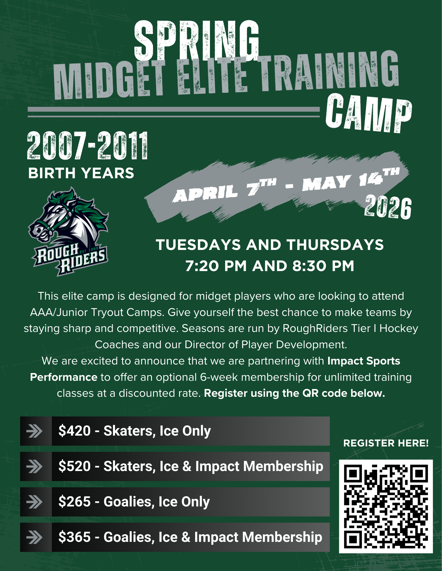 BACK AGAIN THIS YEAR – We are excited to announce that we will be partnering with Impact Sports Performance to offer a 6 week membership for unlimited training classes at a discounted rate. This is an excellent opportunity for athletes to add in their strength and conditioning workouts to go along with the on-ice training over the course of our 6 week camp and to optimize your preparation for upcoming tryouts and fall season. This is optional and is not required for participation in the spring camp.
